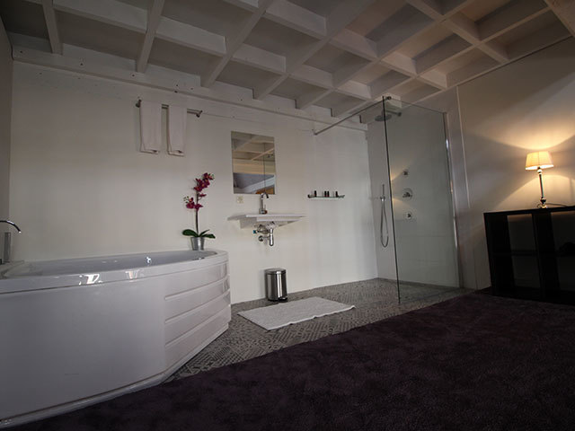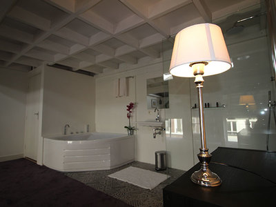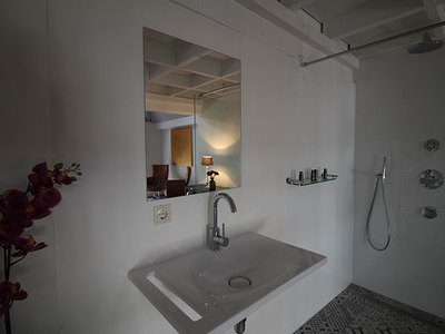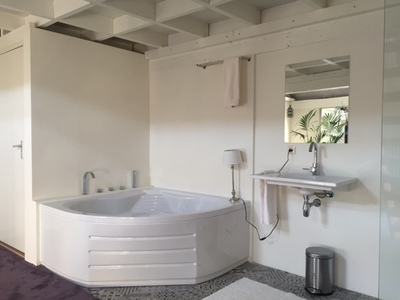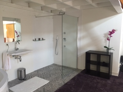 Deze kamer beschikt over een nieuwe open badkamer met een mooie luxe inloop regen douche, design wastafel, riant hoekbad en een separaat toilet. De kamer heeft een double bed van 1.60 met donzen dekbedden en uitstekende hoofdkussens.