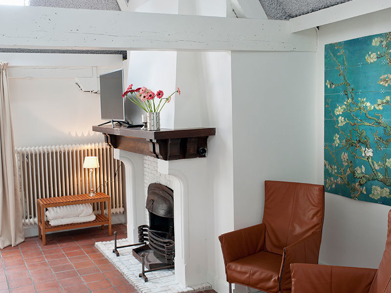 De authentieke patio kamer op de tweede etage heeft een heerlijk eigen terras beschut gelegen tussen het voor en achterhuis. Deze kamer beschikt over een nieuwe open badkamer met een mooie luxe inloop regen douche, design wastafel en een separaat toilet.